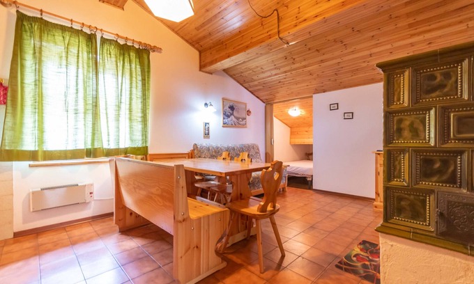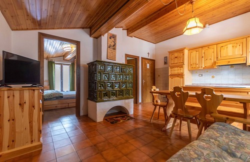 Chalet Catinaccio your alpine refuge in the heart of Soraga How can you not fall in love with this little gem? Chalet Catinaccio is located in a reserved and quiet condominium, but at the same time in the heart of Soraga, just steps away from all the main services.The apartment is a two-room attic apartment on the third floor (without elevator), perfect for 4 guests, consisting of:- Welcoming living area with ceramic glass kitchenette and large refrigerator- Double sofa bed- Characteristic mussa, typical wood stove (only decorative), which adds a touch of tradition- Master bedroom with direct access to a large panoramic terrace with breathtaking view of Sassolungo- Light fir furnishings, which recall the authentic atmosphere of mountain hutsImagine winter evenings, while it snows outside, sipping a glass of wine while watching the snowflakes fall from your balcony... a true spectacle! Although there is no reserved parking spot, convenient free parking is available just 100 meters from the accommodation.Chalet Catinaccio is the ideal solution for those looking for an intimate, characteristic, and central refuge, with an unforgettable view of the Dolomites. What are you waiting for? Book your stay at Chalet Catinaccio now and experience the magic of Val di Fassa!