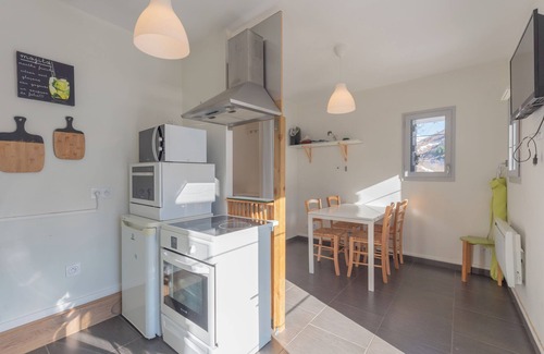 Access via an outside staircase (about 30 steps): kitchen/living area (1 comfortable 180 cm trundle bed), shower room with wc, 1 bedroom (1 it 2 pl 160 cm), exit to panoramic outside terrace. Unenclosed, sloping grounds, private parking. Electric heating included. WIFI. Other Gîte on 1st floor, sleeps 13, to accommodate up to 17 people.
