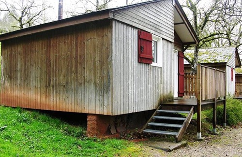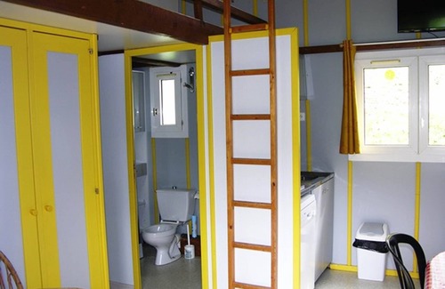 This chalet is part of a group of 3 located near a pond dedicated to trout fishing. Its location is very shaded, facing north, facing the medieval village of Panat. It is in a dominant position, its access requires 5 steps to reach the terrace. Inside you have a bedroom with a double bed plus a bedroom with 2 bunk beds and a mezzanine sleeping 2 (access with a rung ladder). It is known for its relative freshness in the middle of summer.