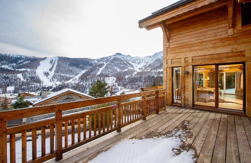 In the heart of the Parc du Mercantour on the famous resort of Auron, the Cocoonr/Book&Pay agency offers you to rent this 350 m² chalet which can accommodate up to 11 guests. The light-filled chalet has 4 levels, a double living area of over 100 m² (with fireplace) on two levels, a fully equipped kitchen, five beautiful bedrooms, four bathrooms (with shower and bath) and you can enjoy a garden of around 500 m² and several terraces. Wifi, bed linen and towels included, we're waiting for you!