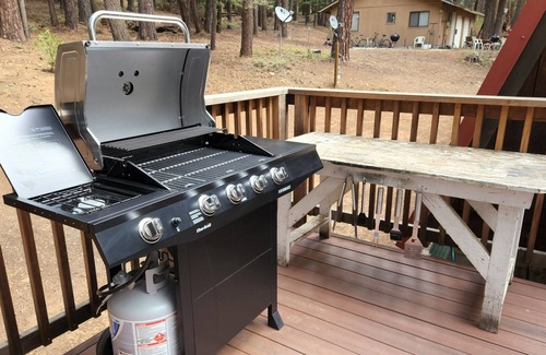 When you walk in the front door of the Chalet, you feel so relaxed. The view is all tinted windows to the top of the Gable style A-Frame that leads to a magnificent huge deck that you will enjoy a hot cup of coffee in the mornings, and many hours of enjoyment just sitting at the tables among the forest. We also have a Char-Broil 4-Burner Liquid Propane Gas Grill for any barbecuing. Nothings beats a good barbecue whether hamburgers & hot dogs, steak or fish. Just imagine corn on the cob barbecued to perfection. On the deck is also an old-fashioned barrel waterfall. The sound of the water cascading is so serene. At night you just might possibly see, 2-3 deer roaming through the property.