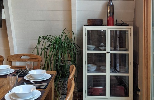 Our Chalet has an open concept from the kitchen to a beautiful living and dining room. Decorated with a theme that you will see some unique painted designs and throw carpets. If you are someone who loves to read, we have a number of books just for you. Plus a portable Bluetooth Speaker to make your music sound amazing. A smart 55" big screen television with Roku's streaming channels is mounted on the wall as you watch from a comfortable sofa and captain's chair. We have included the Wi Fi internet for you. The dining room table is rather unique. It sits 6 but can be expanded. It is made of hard wood.