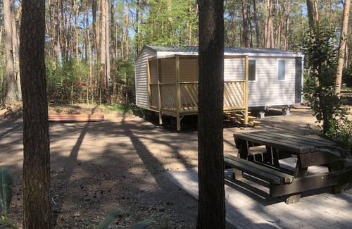 Nestled within serene pine forests, this chalet offers the perfect getaway for families seeking relaxation and adventure. The detached chalet features a spacious living room with an open kitchen, equipped with modern appliances like a fridge-freezer, microwave, and Senseo coffee machine, ideal for preparing meals or enjoying a morning coffee. The living area flows onto a partly covered veranda, a perfect spot to enjoy the fresh air. Adjacent to the veranda, a charming treehouse-like structure provides hours of fun for children, letting them explore and climb. Inside, the chalet comfortably accommodates up to four guests with two bedrooms, one with a double bed and the other with two single beds. The bathroom includes a shower and sink, with a separate toilet for added convenience. For entertainment, the chalet is equipped with free Wi-Fi, a digital TV, and heating for those cooler evenings. Parking is available right next to the chalet for easy access. For those eager to explore, the surrounding area offers a wealth of attractions. Just a short drive from the campsite, you’ll find Antwerp, a city rich in culture and history, where you can visit the Rubens House, the Chocolate Museum, and one of Europe’s oldest zoos. Families will love the nearby Bobbejaanland amusement park, offering thrilling rides and shows just 20 minutes away. Nature lovers can enjoy walks through the scenic trails, and nearby De Lilse Bergen and Netepark provide outdoor pools for fun-filled days in the sun. After a day of exploration, head to La Cantina restaurant at the campsite for a taste of Spain, where tapas are served alongside refreshing sangria and live flamenco music on weekends. For a more casual experience, the campsite bar offers a great spot to unwind with drinks and light bites.