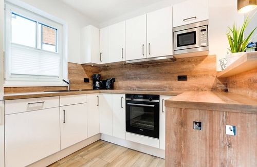 Layout: Ground floor: (Living room(TV, decorative fireplace), open kitchen(coffee machine(cups, filter), oven, microwave, dishwasher, fridge-freezer), bedroom(double bed(boxspring), TV), bathroom(shower, washbasin, toilet))
