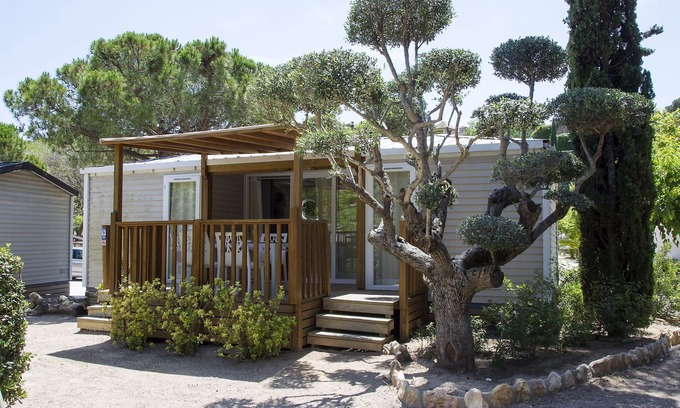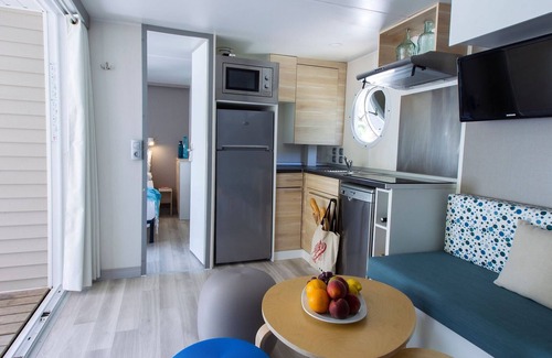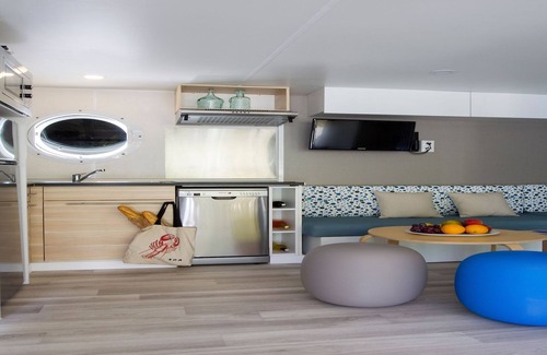 This 5-pers. chalet has two bedrooms, one with a double bed and one with two 1-pers. beds and a 1-pers. high sleeper. The chalets have air conditioning, an open kitchen with dishwasher and microwave and two bathrooms with shower and toilet. You have a (covered) terrace/veranda and there is parking for one car. For an extra car you pay € 12 per night on the spot.