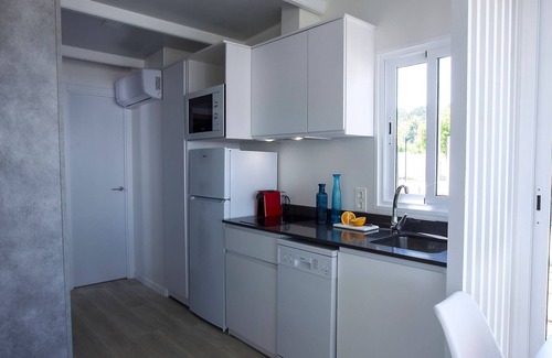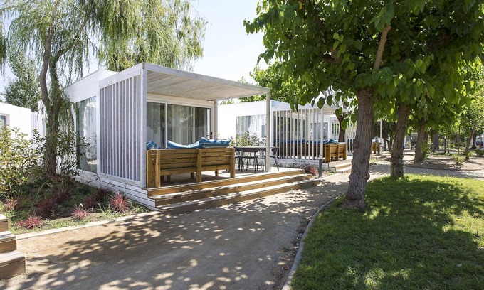 This 5-pers. chalet has two bedrooms, one with a double bed and one with two 1-pers. beds and a 1-pers. high sleeper. These chalets were built in 2020 and have air conditioning, an open kitchen with dishwasher and microwave and a bathroom with shower and toilet. You have a (covered) terrace/veranda and there is parking for one car. For an extra car you pay € 12 per night on the spot.