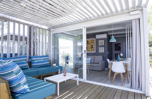 Layout: Ground floor: (Living room(TV(cable, flatscreen)), open kitchen(toaster, cooker(ceramic), coffee machine(cups), microwave, dishwasher, fridge), bedroom(double bed(150 x 200 cm)), bedroom(2x single bed, single loft bed), bathroom(shower, washbasin, toilet), Internet access) heating, air conditioning, terrace(roofed), garden furniture, parking, swimming pool(shared with other guests, outside)