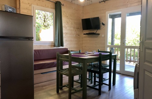 Relax on the deck or patio (enjoy the outdoor furniture!) of this 366-sq-ft chalet. As for the great indoors, you can come inside and enjoy the WiFi and TV.