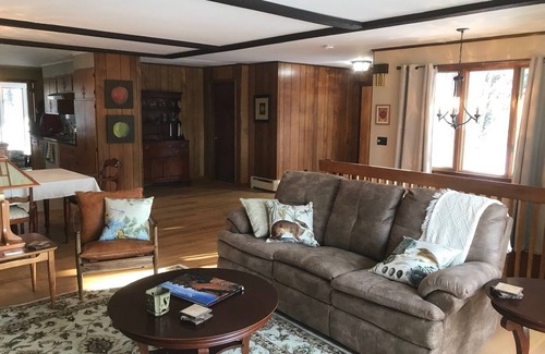 Spacious, rustic, rural home with 2 master suites, large living room upstairs and family room downstairs with wet bar, and guest bedroom. Close to town, within 25 minutes of both Stowe and Smugglers Notch ski areas and very close to historic Route 100. Perfect place to stay for winter snows, spring buds, summer activities and viewing the fall colors.