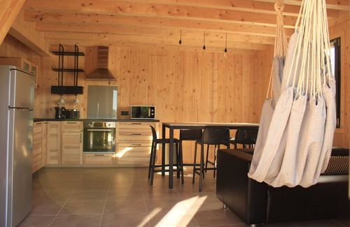 Layout in raw wood to RT 2012 standard, wooden frame of 70 m2 with terrace of 31m2, capacity for 6 people: open living kitchen with snack table, LED TV Full HD 101cm (40 "), Free WIFI, you have 3 bedrooms , 2 doubles with 160x200 memory foam mattress, one on the ground floor and a third with 2 single beds 90x200 upstairs, a bathroom with 2 sinks and Italian shower on the ground floor, separate toilet on the ground floor and upstairs. HEATING INCLUDED. Private parking next to the chalet.
