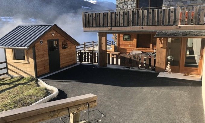 Large apartment on the ground floor of the owners' house, on one level (separate entrance). Entrance hall (shared entrance with the owner's workshop), entrance, living room-kitchen, 2 bedrooms (1 double bed 140x190 cm / 1 double bed and 1 single bunk bed 90x200 cm), bathroom (shower), separate toilet, laundry room. Large private and fenced terrace of 80 m2, sloping ground. Parking in front of the accommodation. This comfortable apartment, ideally designed to accommodate holidaymakers wishing to rest, offers a large sunny terrace where you can enjoy meals and moments of relaxation. A few kilometers from Bellentre and facing the slopes of La Plagne, enjoy a view of the entire valley and the proximity of the hiking departures.
