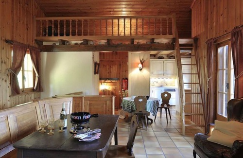 "Chalet le Chamois", 4-room chalet 110 m2 on 3 levels. Comfortable and cosy furnishings: living/dining room with satellite TV and paraffin heater. Exit to the terrace. Open kitchen (oven, dishwasher, 4 ceramic glass hob hotplates, microwave, fondue Set (cheese)). Sep. WC. On the lower ground floor: 1 room with 1 french bed (150 cm, length 190 cm). 1 room with 3 beds (90 cm, length 190 cm). Exit to the garden. 1 room with 1 bed (90 cm, length 180 cm). Bath/shower/WC. Large terrace, large garden. Terrace furniture, barbecue. Marvellous panoramic view of the mountains and the countryside. Facilities: Internet (WiFi, free). Please note: non-smokers only. Maximum 2 pets/ dogs allowed.
