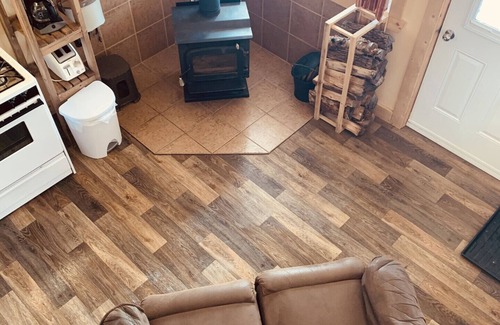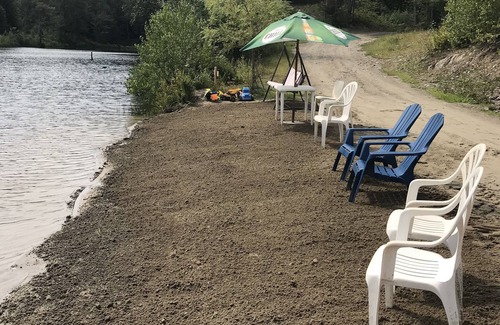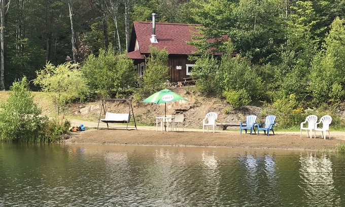 Aux abords du lac Logan, construction rustique, pour 2 à 6 personnes, chambre fermée lit queen, mezzanine avec 2 lits doubles- électricité douche- toilette-foyer.
