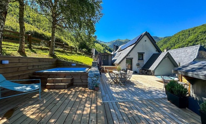 Chalet René Sens is a true haven of peace for all those looking for calm and proximity to nature, in this small hamlet in the heart of the Pyrenees. This gîte is ideally located for hiking enthusiasts or for sporty cyclists doing the Route des Cols. It offers stunning mountain and valley views. A parking area is reserved a few meters from the gîte, at the entrance to the hamlet. Pets not allowed. Non-smoking house. Around the cottage, you can easily go to the Mourtis ski resort (skiing, snowshoeing, hiking, mountain activities, etc.) 8km away, to the remarkable Aspet market 12km away (swimming pool, tennis, shops), in Saint-Béat and Lake Géry 20km away, or in Montréjeau (lake, swimming, golf), Bagnères-de-Luchon (thermoludicism) or Bossost in Spain, 40km away. The owners, Olivier and Anne-Laure, recently renovated this chalet while paying particular attention to the materials used, the production of renewable energy and the comfort of their guests, without neglecting the decoration, which is both warm and trendy! When you return from your mountain getaways, plan time to enjoy the Nordic bath outside! You will access the gîte via a few steps: On the first level: entrance, living room with fitted kitchen, dining area and lounge (wood stove, connected TV), very small bedroom with 1 90cm single bed, separate WC. On the half-landing: access to the terrace (Nordic bath) and the garden. On the second level: WC, laundry room (washing machine and dryer), bathroom (bath), 1 attic bedroom for 2 people with 1 160cm bed, 1 attic bedroom for 2 people with 2 90cm beds (possibility of pair them up), small reading room (library). Electric heating (electricity produced by photovoltaic panels) and wood stove, Internet access (Wifi connection).