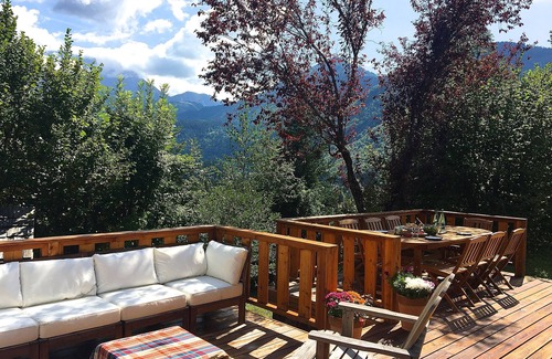 Large deck with outdoor seating and outdoor dining area offering spectacular views of the Mt Blanc massif