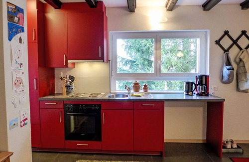 3-room apartment 45 m2 on 2 levels. Comfortable and cosy furnishings: large kitchen-/living room (4 hot plates, oven, dishwasher, toaster, kettle, electric coffee machine, raclette grill, fondue Set (cheese)) with dining nook and radio. Exit to the garden. Shower/WC. Underfloor heating. Upper floor: large living/sleeping room with 1 double bed, digital TV, flat screen and DVD. Exit to the balcony. 1 children's room 6 m2 with 1 x 2 bunk beds (90 cm, length 200 cm). Patio. Terrace furniture, barbecue, deck chairs. Very beautiful view of the mountains, the valley and the countryside. Facilities: baby cot for up to 2 year olds (extra). Internet (WiFi, free). Parking at 100 m. Please note: non-smokers only.