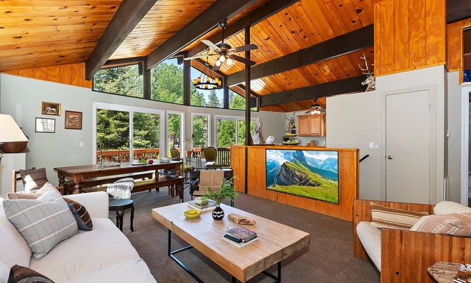 Enter the open-plan living room where vaulted ceilings, large windows, and double sliding glass doors fill the space with natural light. Relax on the sectional in front of the wood-burning fireplace or enjoy a family movie night on the 65” Bluetooth TV. The adjacent dining area and kitchen are fully equipped for your stay, featuring a solid wood dining table and a full coffee bar for your morning brew.