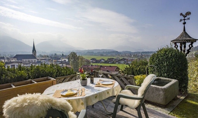 Our holiday home at Leitweg 32 in 6345 Kössen is five minutes from the town center and is idyllically situated in a beautiful, unobstructed and quiet location on the edge of the forest. The house and its garage are yours to enjoy for the entire duration of your stay. Enjoy the unique panoramic view of the whole of Kössen, the Kaiser Mountains, the Unterberg, and the other surrounding mountains. In winter, enjoy it from the living room in the cozy warmth of the tiled stove, or in summer, while sitting comfortably on the terrace.