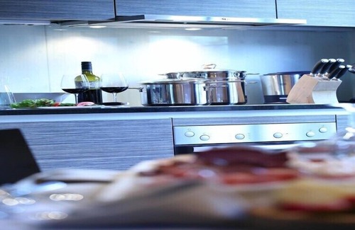 Layout: Kitchen(hob(ceramic), coffee machine, oven, microwave, dishwasher, fridge-freezer), Living/diningroom(double sofa bed, TV(satellite), dining table), bedroom(double bed), bedroom(double bed), bedroom(double bed), bedroom(double bed), bathroom(shower), bathroom(shower), toilet, toilet, washing machine, balcony or terrace, heating, parking, high chair, baby crib(free)