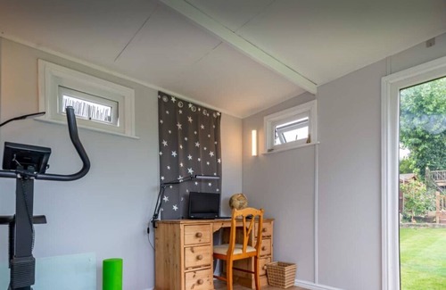 The multi purpose garden room has a desk to cater for working from home, and gym equipment.
