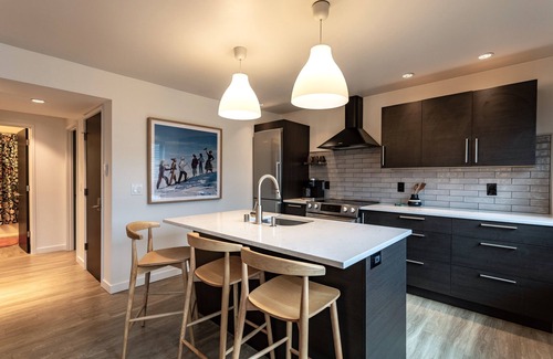 Experience Alaska living at its finest in our two-bedroom Chalet Suite in Juneau's Historic Flats District. This fully furnished apartment, designed by Bauer/Clifton Interiors, is well-appointed and has quality finishes throughout. It includes a modern kitchen with quartz countertops, an open floor plan with designer furnishings, and a modern bathroom with a deep soaking tub.
