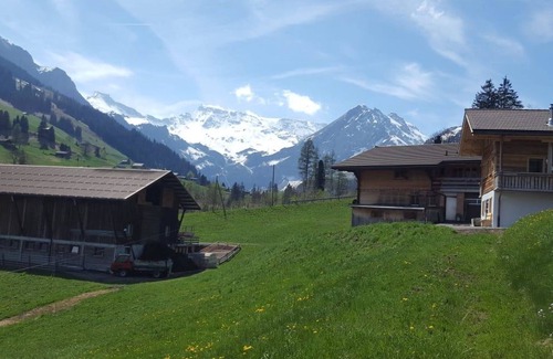 We rent a new, romantic, rustic "Stöckli" small chalet close to the farm in the countryside. You can expect a living room with sofa (extendable) rocking chair, TV, radio and wireless internet. A small kitchen with fridge, oven, 2 hotplates, dishwasher and coffee machine. On the upper floor there is 1 bedroom with double bed, a small sleeping alcove for 1 mattress or a camping bed and 1 bathroom with shower and toilet + washing machine. For the clothes, it has a spacious closet. Balcony with view of the mountains soiwe very quiet seat. Parking available. It also has a storage room for skis and bicycles. Pets on request. Ideal is the chalet for couples or a family with a child (two children on request). Bus stopp near by.