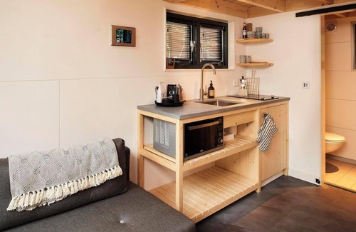 Tiny House 2 is a small, cosy chalet that brings you closer to nature with all its natural influences. It is equipped with all comforts in a small number of square metres. Tiny House 2 is suitable for 2 persons and has a sleeping loft with a double bed, which can be reached with a ladder. In the living area you will find a cosy sitting area with television, a dining area and a compact kitchen with, among other things, a combination microwave oven and a Nespresso Machine. The bathroom has a shower and toilet. Outside you can enjoy the terrace. The Tiny House adjoins a communal outdoor courtyard with a fire pit, where you can also barbecue and a lovely (shared) hot tub*! You can use free Wi-Fi and park one car at Tiny House 2. Please note, It is not possible to place a baby bed / camp bed in this accommodation.