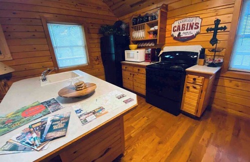 True romance is here, experience stunning sunrise views from our most luxurious and spacious one-bedroom cabin nestled in a Pine tree grove. The cabin features: