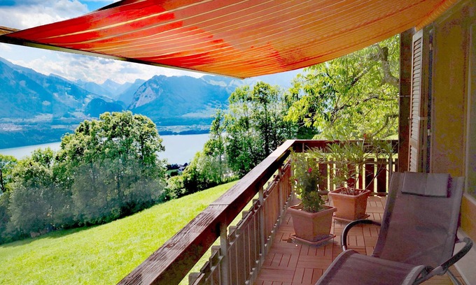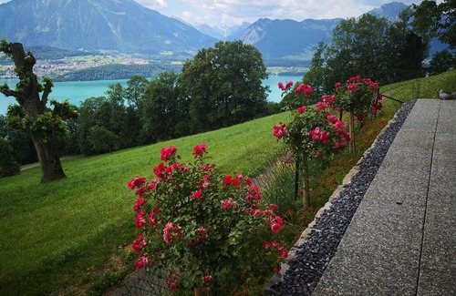 Chalet Xanadu, a sunny south-facing authentic Swiss Chalet is located in an idyllic region, with stunning views over Lake Thun and the Alps including Jungfrau, with no tourists around yet close to many touristic attractions including Interlaken. It's a great place for a peaceful and relaxing vocation.