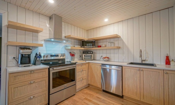While you're here, you can enjoy all the comforts of home and more, including a refrigerator and an oven, as well as a stovetop and a dishwasher. Other amenities include towels, kitchenware and utensils, and a toaster.
