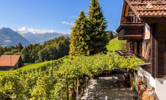 7-room chalet 140 m2 on 3 levels. Rustic and cosy furnishings: living/dining room with dining table and tiled stove. Exit to the balcony. Living room with digital TV. Kitchen (4 hot plates, oven, dishwasher, toaster, kettle, electric coffee machine, Capsules for coffee machine (Nespresso) extra) with dining table. Bath/WC. On the lower ground floor: 1 large room with 1 double bed (2 x 90 cm, length 200 cm), hand-basin. 1 children's room with 2 x 2 bunk beds (90 cm, length 200 cm), hand-basin. Bath/WC. Upper floor: (steep stair), 2 rooms with sloping ceilings, each room with 1 double bed (2 x 90 cm, length 200 cm). Exit to the balcony. 1 small room with 1 french bed (160 cm, length 200 cm). Shower/WC. Wood heating. 2 balconies, large terrace, patio. Terrace furniture, barbecue. Marvellous panoramic view of the lake, the mountains, the valley and the countryside. Facilities: washing machine, children's high chair, baby cot, logs (free). Internet (WiFi, free). Parking (6 cars), garage at the house. Please note: suitable for families. Non-smoking house.