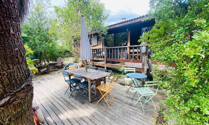 (Text automatically translated) ideally located, quiet, comfortable, large covered terrace of 20 sqm, warm and unique setting, careful on the sea theme decor, three bedrooms, one of 25 m² with bathroom, TV, sofa, 160 bed, garden exotic terrace with teak and bamboo outdoor shower