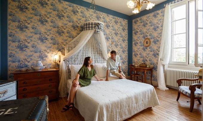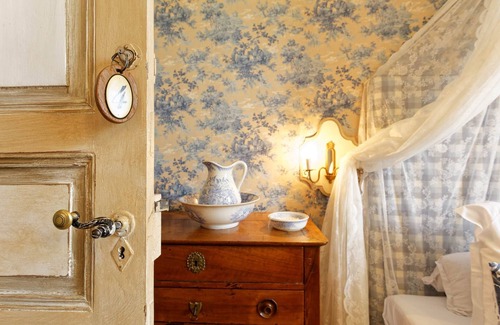 Bed and Breakfast with handmade wallpaper, in the style of "toile de Jouy": it represents traditional scenes of country life in the seventeenth century. Its shades of blue on a beige background gives the space a bucolic and soothing appearance. This original wallpaper is highlighted by the furnishings and decoration made of carefully selected objects.