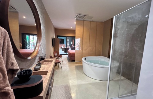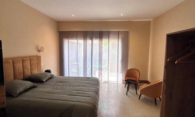 The spacious rooms are equipped with a double balneotherapy unit, a steam shower, a Japanese toilet, a Dyson hair dryer, and a fully equipped kitchen for your meals in complete freedom. You'll also find a cozy colonial lounge and a superb palm grove terrace, ideal for enjoying the included breakfast or relaxing outdoors.