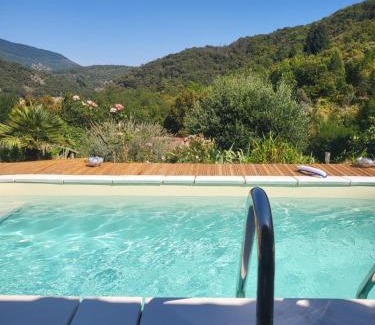 Chambres d'hôtes La Storya enjoys a location in Meyras, 31 miles from Pont d'Arc and 8.4 miles from Casino de Vals-les-Bains. The property is around 24 miles from Mont Gerbier, 31 miles from Chauvet Cave, and 31 miles from Domaine de Barres Golf Course. Featuring a private entrance, the bed and breakfast allows guests their privacy. At the bed and breakfast, the units include a wardrobe and a flat-screen TV. The rooms come with a coffee machine, a private bathroom, and free Wifi, while some rooms come with a terrace and some have mountain views. At the bed and breakfast, the units come with bed linen and towels. A selection of options including fresh pastries, fruit, and juice are served for the continental breakfast. Guests may go to the family-friendly restaurant, while packed lunches are also available. You can play darts at the bed and breakfast. Guests can swim in the pool with a view, relax in the garden, or go skiing or cycling. Le Puy – Loudes Airport is 50 miles away.