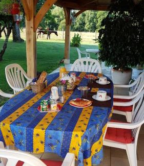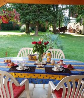 Offering garden views, Chambres d'Hotes Carpediem in Prigonrieux offers accommodations and a garden. This property offers access to a terrace, free private parking, and free Wifi. Guests can access the bed and breakfast via private entrance. At the bed and breakfast, the units are equipped with a wardrobe, a flat-screen TV, a private bathroom, bed linen, and towels. The rooms are equipped with a kettle, while certain rooms here will provide you with a fully equipped kitchenette with a stovetop and kitchenware. The rooms are equipped with heating facilities. A continental breakfast, comprising fresh pastries and juice is served at the property. Guests at the bed and breakfast will be able to enjoy activities in and around Prigonrieux, like hiking. The bed and breakfast has a picnic area where you can spend the day outdoors. Bergerac Train Station is 3.5 miles from Chambres d'Hotes Carpediem, while Château Les Merles Golf Course is 12 miles away. Bergerac Dordogne Périgord Airport is 7.5 miles from the property.