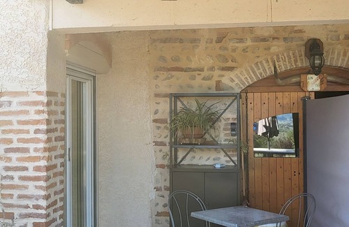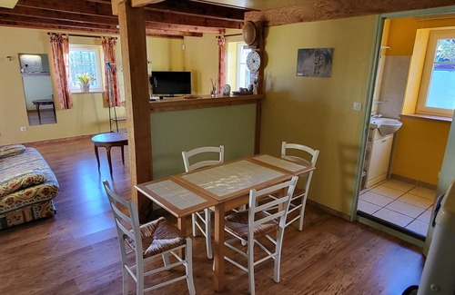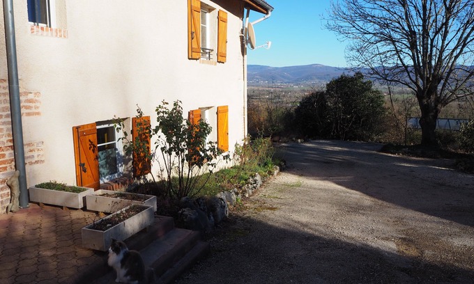 Equipped studio in an old isolated farmhouse, inhabited by the owners, on a large enclosed plot overlooking the Ain river, a terrace with a magnificent view of the Bugey mountains. Between Lyon and Geneva, 5 km from the motorway and shops.
