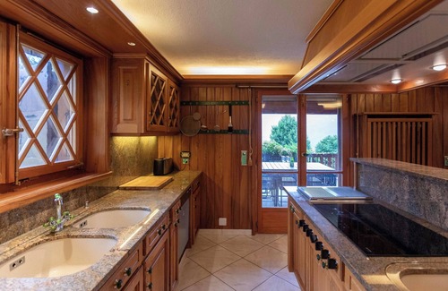 "Champ de Brent", 8-room chalet on 3 levels, south facing position. Comfortable and stylish furnishings: large living/dining room with open-hearth fireplace and bar. Exit to the terrace, south-east facing position and south facing position. Large entrance hall. Office. Open kitchen (dishwasher, 4 induction hot plates, toaster, kettle, microwave, freezer, electric coffee machine) with bar. Sep. WC. On the lower ground floor: 1 room with 1 double bed (160 cm, length 200 cm), bath/bidet/WC. Exit to the garden, to the terrace. 1 room with 1 double bed (160 cm, length 200 cm). Exit to the terrace. Large living room with TV. Exit to the garden, to the terrace, south facing position. Sep. WC. Upper floor: 1 large room with 1 double bed (180 cm, length 200 cm), bidet, separate WC, shower/WC, double hand-basin and TV. Exit to the balcony. 1 room with 1 double bed (160 cm, length 200 cm). Exit to the balcony. 1 room with 1 double bed (160 cm, length 200 cm), bath/WC. Exit to the balcony. Bath/bidet/WC. Carpet. Balcony, large terrace. Terrace furniture. Marvellous view of the mountains, the countryside and the resort. Parking (4 cars), garage (1 car). Please note: non-smokers only.