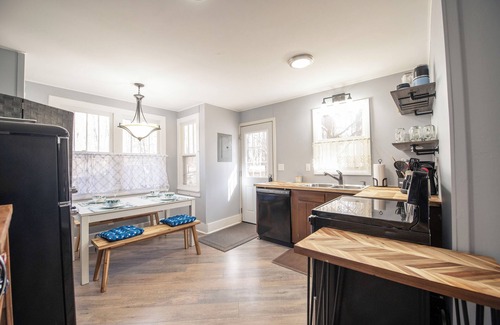 Inside, the cottage features two bedrooms, a living room, and a newly updated kitchen with butcher block countertops. Enjoy coffee by morning and a glass of wine by evening in either the kitchen's dining nook, or the screened-in front porch. These enchanted spaces are also perfect for playing games or nature watching! Outdoors, the large bonfire area is perfect for evenings with family and friends under the stars. The backyard, strung with sparkling lights, is perfect for cooking meals on the charcoal grill, making s'mores around the bonfire, or relaxing in a hammock with a cool summer breeze.