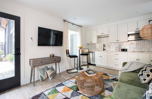 Introducing "Champagne Wishes," a newly constructed, freestanding guest house townhome nestled in the heart of the Old 4th Ward, designed and built by local Atlanta home builder. This creative and artistic haven features a sunlit king bedroom, a full bathroom with a bathtub, and a workstation—all upstairs. The custom-built slatted wood partition wall and garden views add to the serene ambiance. Downstairs, enjoy fabulously stocked kitchen and comfortable living areas, all maintained at the perfect temperature with high-end European mini-split systems. High-speed internet and a Ring security system offer both convenience and security. Just a short walk from the vibrant Ponce City Market and the Beltline. Champagne Wishes is an ideal retreat for those seeking design, comfort, and the convenience of city living. As a guest of Minty Living, you'll enjoy access to our favorite local providers with exclusive discounts and coupons, ensuring an unforgettable Atlanta experience.