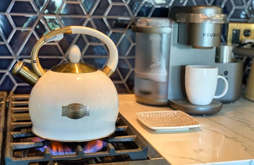 A peninsula in the kitchen is a great spot for coffee or to set up a buffet. The kitchen is equipped with a 5 burner gas stove, microwave, dishwasher and a full sized refrigerator with ice maker. There is a coffee maker, toaster, blender, pots & pans and dinner service for 8.
