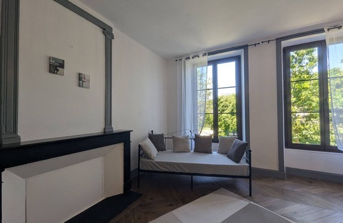 - A large, very bright bedroom with parquet flooring and a decorative fireplace, furnished with a double bed, a chaise longue that can be used as an extra bed, and a desk offering the possibility of working from home (Wi-Fi);