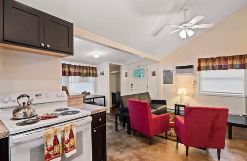 The Chardonnay @ Grape Arbor Cottages is within a short walk of the famous "Strip" yet away from the hustle and bustle. This completely rebuilt all-electric 2-bedroom cottage has cathedral ceilings, full kitchen & appliances, baseboard heat, A/C, WiFi, Smart TV. Enjoy the attractions all within a short drive/walk. Catch a Winery shuttle across the street at the Lodge.
