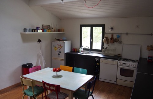 Sleeps 7 people. On the ground floor a large bedroom (bed 160X200), a bedroom (bed 140X190), a large kitchen / dining room (fridge freezer, washing machine, dishwasher, gas stove, microwave, kettle, toaster, coffee maker filter and coffee maker nespresso), a bathroom with large walk-in shower, a separate toilet, a living room with fireplace. On the floor a big room with two big beds (140X190 and 120X190) and a closed bathroom with WC and washbasin. The house is extended by a large terrace (table, chairs, hammock and deck chairs) and a large unfenced garden (with barbecue) and enjoys absolute calm.