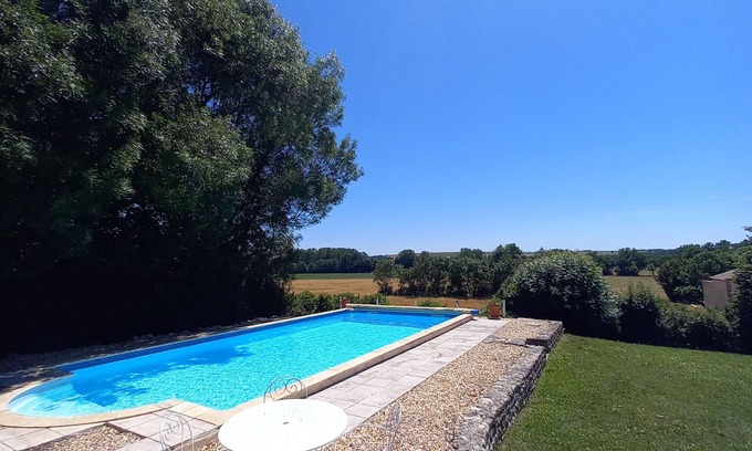 Charente rustic farmhouse with heated pool and wonderful views, sleeps 13 is located in Bonneville. Charente rustic farmhouse with heated pool and wonderful views, sleeps 13 provides accommodation, featuring Pet Friendly, Fireplace/Heating, Entertainment, among other amenities. This House features Pet Friendly, Fireplace/Heating, Entertainment, to make your stay a comfortable one.