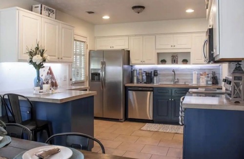 Our home has three bedroom which support one king bed, and two queens, and with the additional sleeper sofa our home comfortably sleeps 8 adults. Additionally, our home offers two full bathrooms, which come with dispensers that contain body wash, shampoo, and conditioner. Leading to the bedrooms is a washer and dryer located on the lefthand side of the hallway. Our laundry station comes equipped with detergent pods, iron, ironing board, and dryer sheets. This home has everything needed to make your stay truly feel like a home away from home.