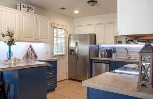 Next, you will see our fully equipped kitchen that was remodeled to our liking with concrete countertops making for easy clean ups after preparing meals for our family and friends. This kitchen has everything you will need in order to prepare meals during your stay. Our latest updates are the stainless-steel appliances we added before our PCS to Ft Liberty, NC in 2021.