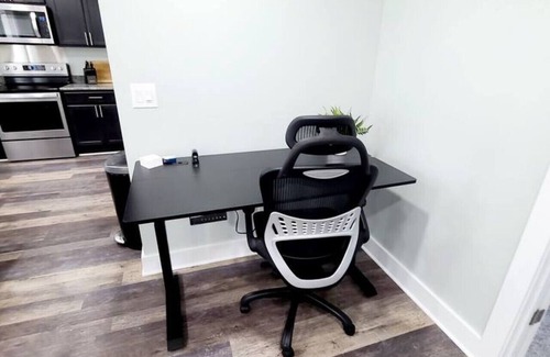 Inside, you’ll find two cozy bedrooms, each with a queen-sized bed and Smart TV, plus an open-concept living room and kitchen. A workstation desk offers sit-or-stand flexibility. The kitchen is fully equipped, and the unit also includes a private laundry for your convenience.
