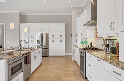 Spacious and Elegant Living: This beautifully designed single-story home features a gorgeous, fully equipped kitchen, perfect for culinary creations, with dining for 8 at the elegant table and additional seating for 6 at the kitchen island. The dedicated office space ensures you can stay productive while on vacation.