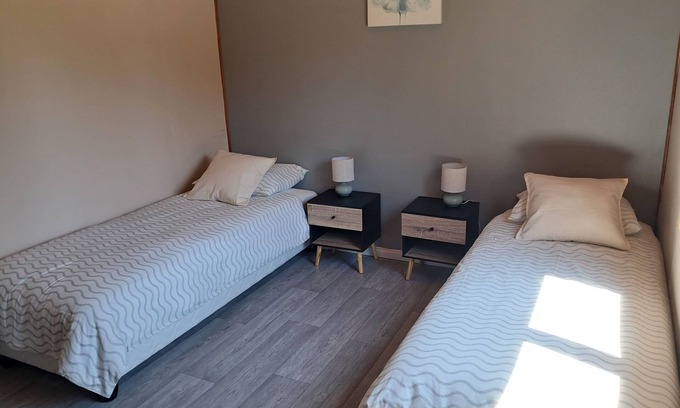 - une chambre avec deux lits simple [possibilité de les mettre côte a côte ] ( matelas neuf juin 2025) avec commode